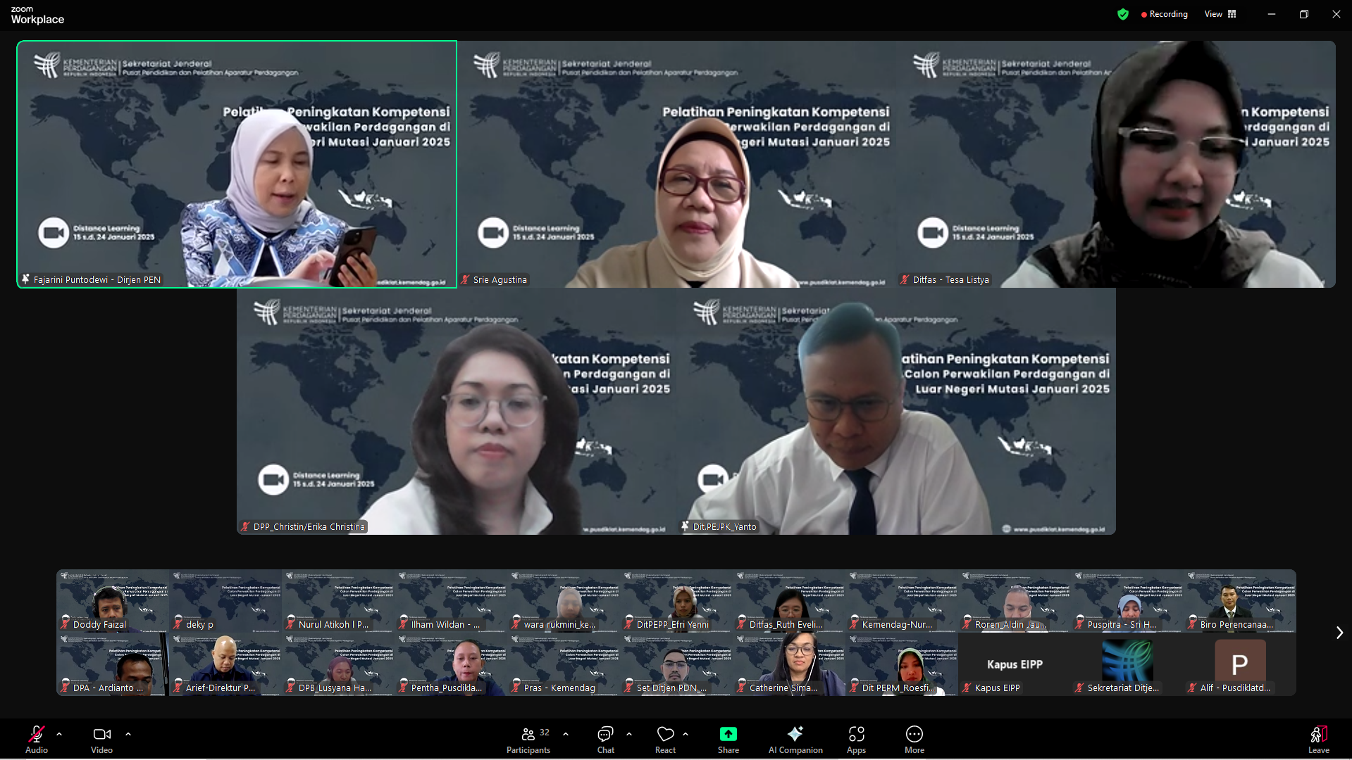 Pusat Pendidikan dan Pelatihan (Pusdiklat) Aparatur Perdagangan menggelar pelatihan intensif bagi 13 pegawai Kementerian Perdagangan yang akan bertugas sebagai perwakilan perdagangan luar negeri periode Januari 2025.