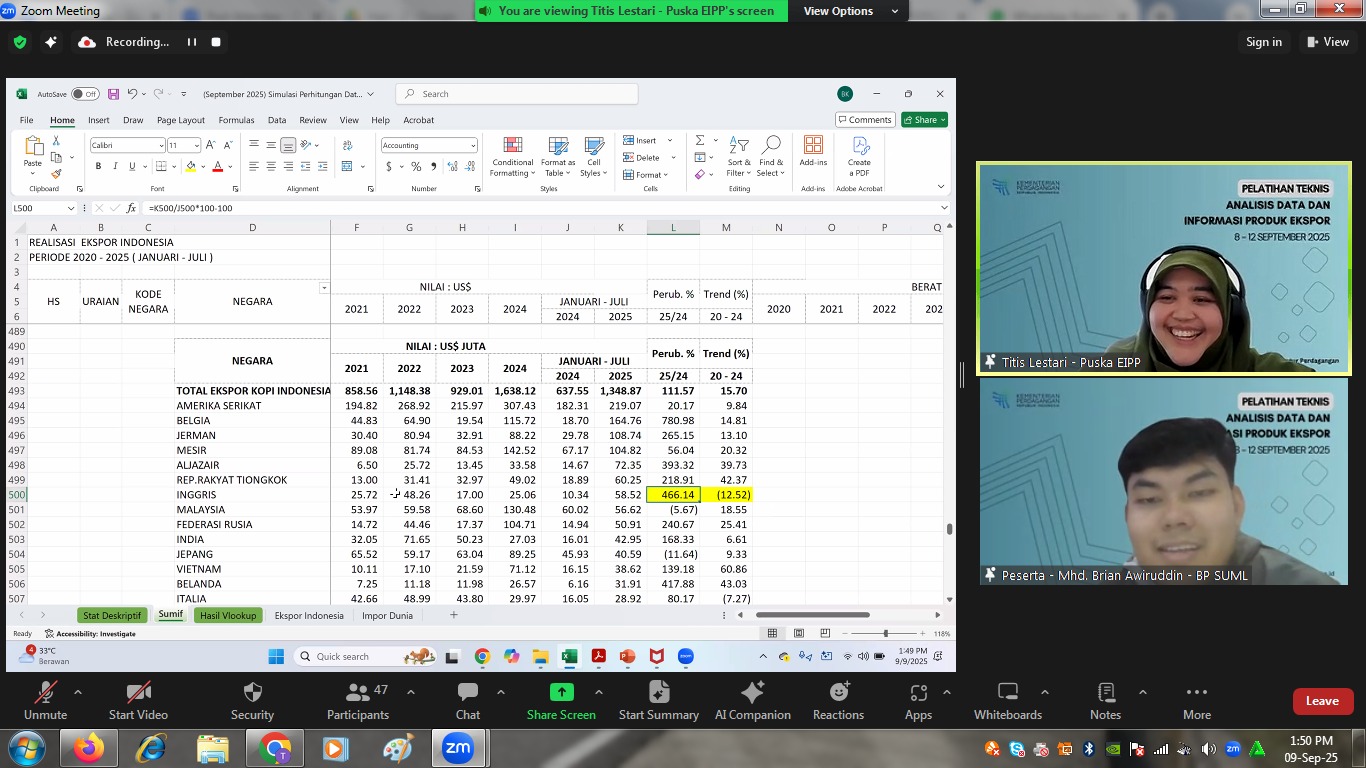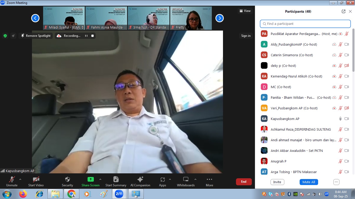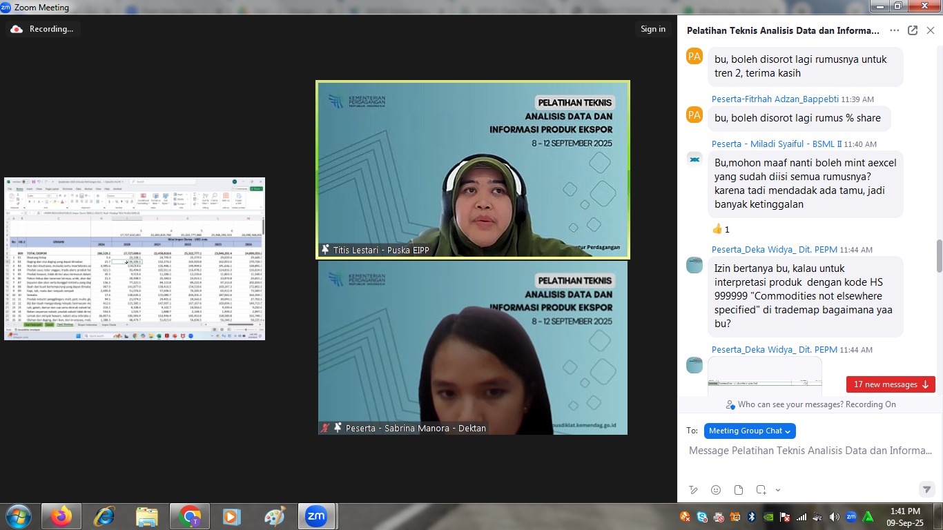 Pusat Pengembangan Kompetensi (Pusbangkom) Aparatur Perdagangan, Kementerian Perdagangan menyelenggarakan Pelatihan Teknis Analisis Data dan Informasi Produk Ekspor secara daring pada 8-12 September 2025. Pelatihan diikuti oleh 39 peserta, terdiri dari 29 orang internal Kementerian Perdagangan dan 10 perwakilan dari Dinas Perdagangan di berbagai daerah. Pelatihan ini merupakan kelanjutan dari pelatihan HS Code, yang menjadi prasyarat untuk memastikan peserta memiliki fondasi pengetahuan yang kuat sebelum mendalami materi analisis data.