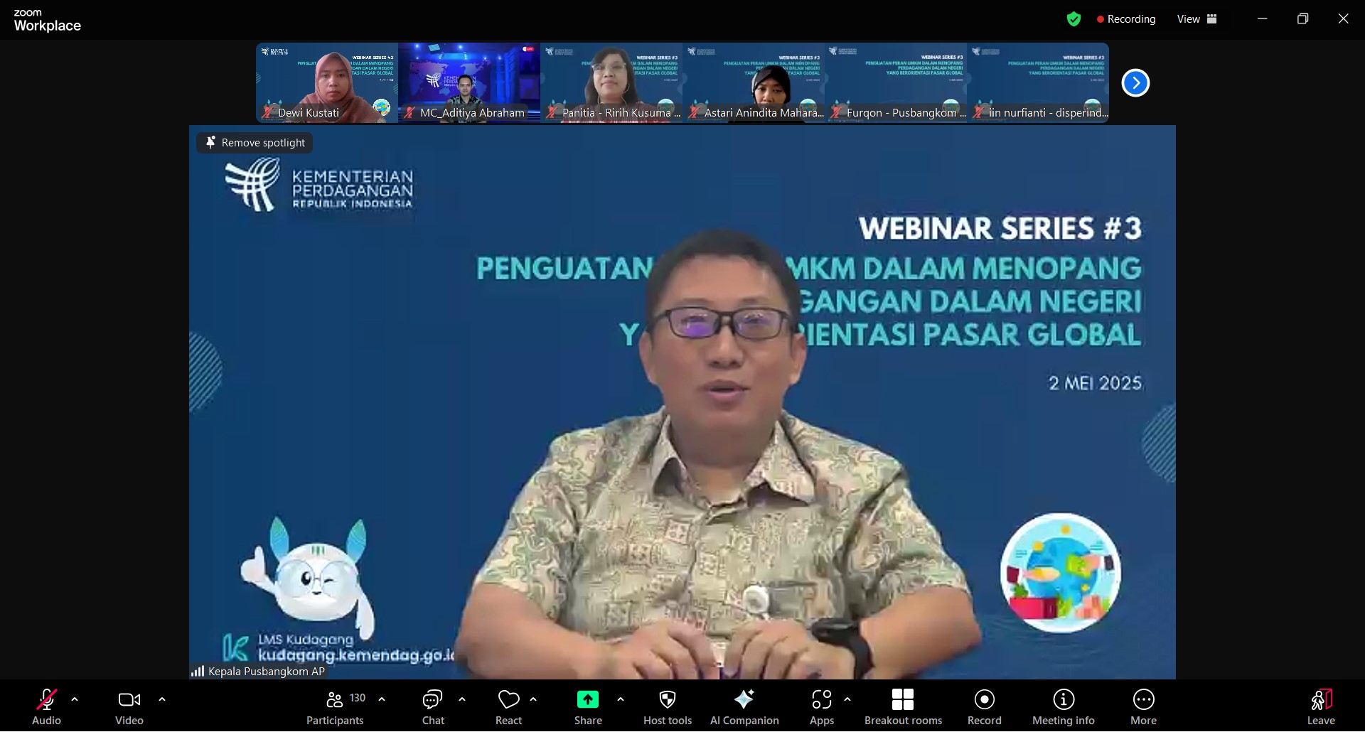 Pusat Pengembangan Kompetensi Aparatur Perdagangan (Pusbangkom AP) sukses menyelenggarakan webinar#3 bertema “Penguatan UMKM dalam Menopang Perdagangan Dalam Negeri yang Berorientasi Pasar Global” pada Jumat, 2 Mei 2025. Diikuti oleh 378 peserta dari ASN Pusat dan Daerah, kegiatan ini bertujuan memperkuat kapasitas ASN dalam menyiapkan pelaku UMKM yang adaptif menjaga keberlanjutan usahanya.