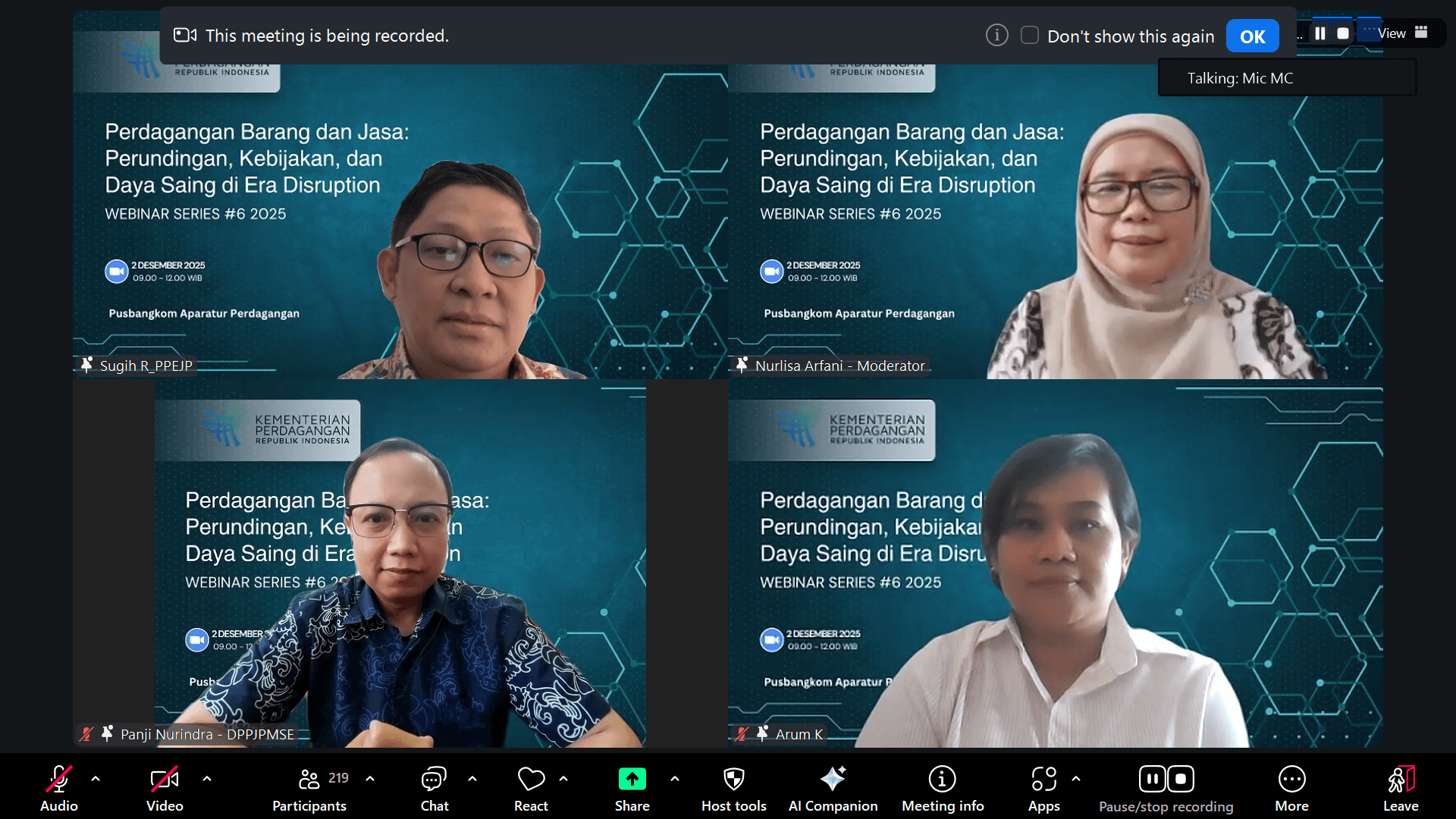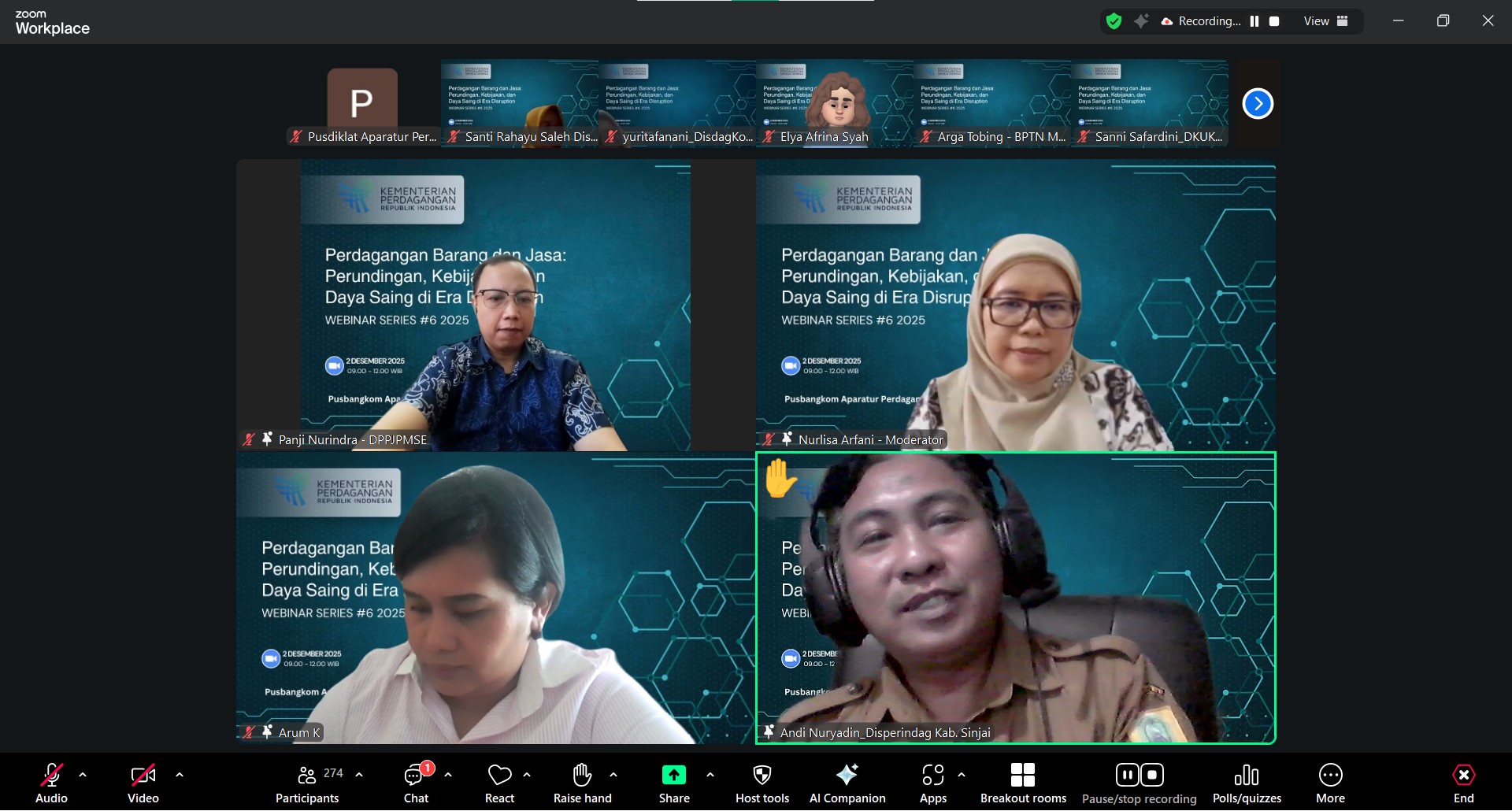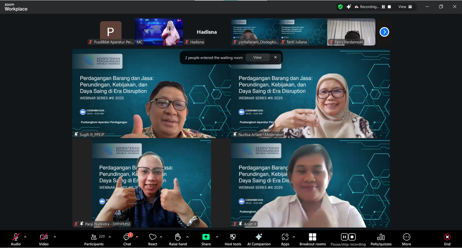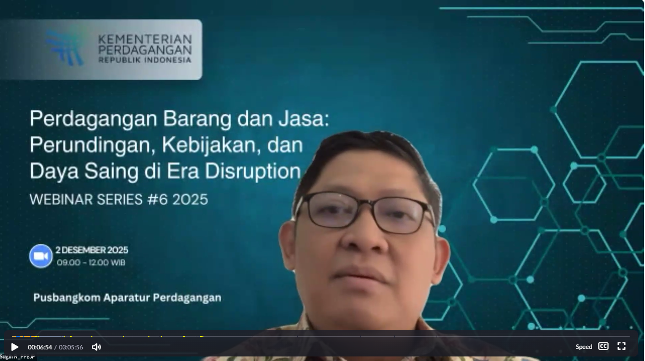 Pusat Pengembangan Kompetensi Aparatur Perdagangan (Pusbangkom AP) sukses menyelenggarakan webinar strategis bertema “Perdagangan Barang dan Jasa: Perundingan, Kebijakan, dan Daya Saing di Era Disruption” pada Selasa, 2 Desember 2025. Diikuti oleh 407 peserta dari ASN pusat dan daerah, kegiatan ini bertujuan memperkuat kapasitas ASN dalam merespons dinamika perdagangan global yang didorong oleh digitalisasi, transformasi rantai pasok, dan perubahan geopolitik.