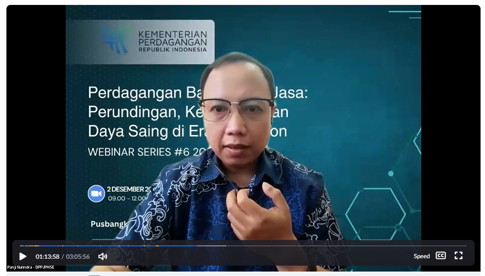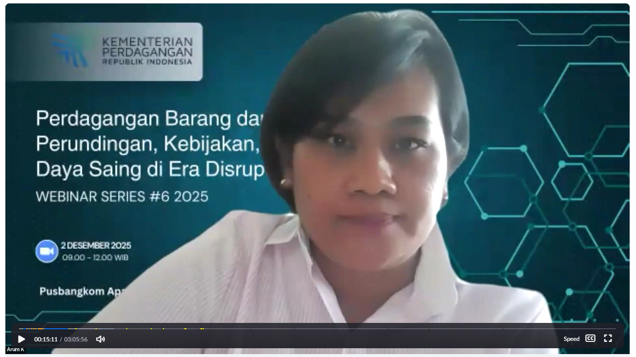 Webinar ini menampilkan dua narasumber: Dr. Arum Kusumaningtyas, akademisi dari Universitas Gadjah Mada (UGM) dan Raden Panji Nurindra Parwoto, negosiator perdagangan, Direktorat Perundingan Perdagangan Jasa dan Perdagangan Melalui Sistem Elektronik Kementerian Perdagangan. Dr. Arum Kusumaningtyas dalam paparannya menyampaikan materi yang berfokus pada perdagangan barang. Beliau menekankan pentingnya sinergi kebijakan antara perdagangan, industri, dan logistik untuk memperkuat daya saing industri di tengah transformasi rantai pasok global. Dr. Arum Kusumaningtyas juga memperkenalkan kerangka kerja PESTEL guna memperkuat kebijakan perdagangan Indonesia sekaligus menciptakan iklim investasi yang menarik. Melalui analisis komprehensif terhadap faktor politik, ekonomi, sosial-budaya, teknologi, lingkungan, dan hukum, pendekatan ini memungkinkan pemangku kepentingan memahami lanskap secara menyeluruh sebelum merumuskan strategi maupun kebijakan baru.